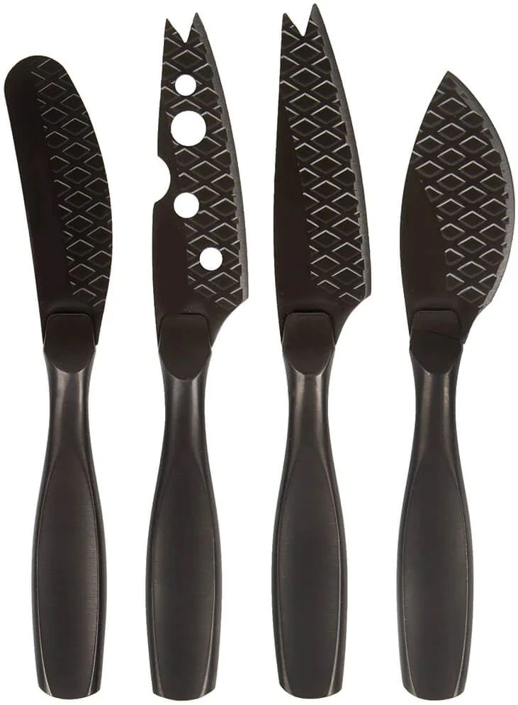 Deze handige messenset bevat vier compacte kaasmessen. Elk mes is geschikt voor een bepaald type kaas. Gebruik het smeermes voor verse kaas en het mes met de gaten in het lemmet voor zachte tot half harde kaas. Prik stukken half harde kaas aan de punten aan het mes met de gevorkte punt en gebruik het Parmesan mes om harde kaas te breken.