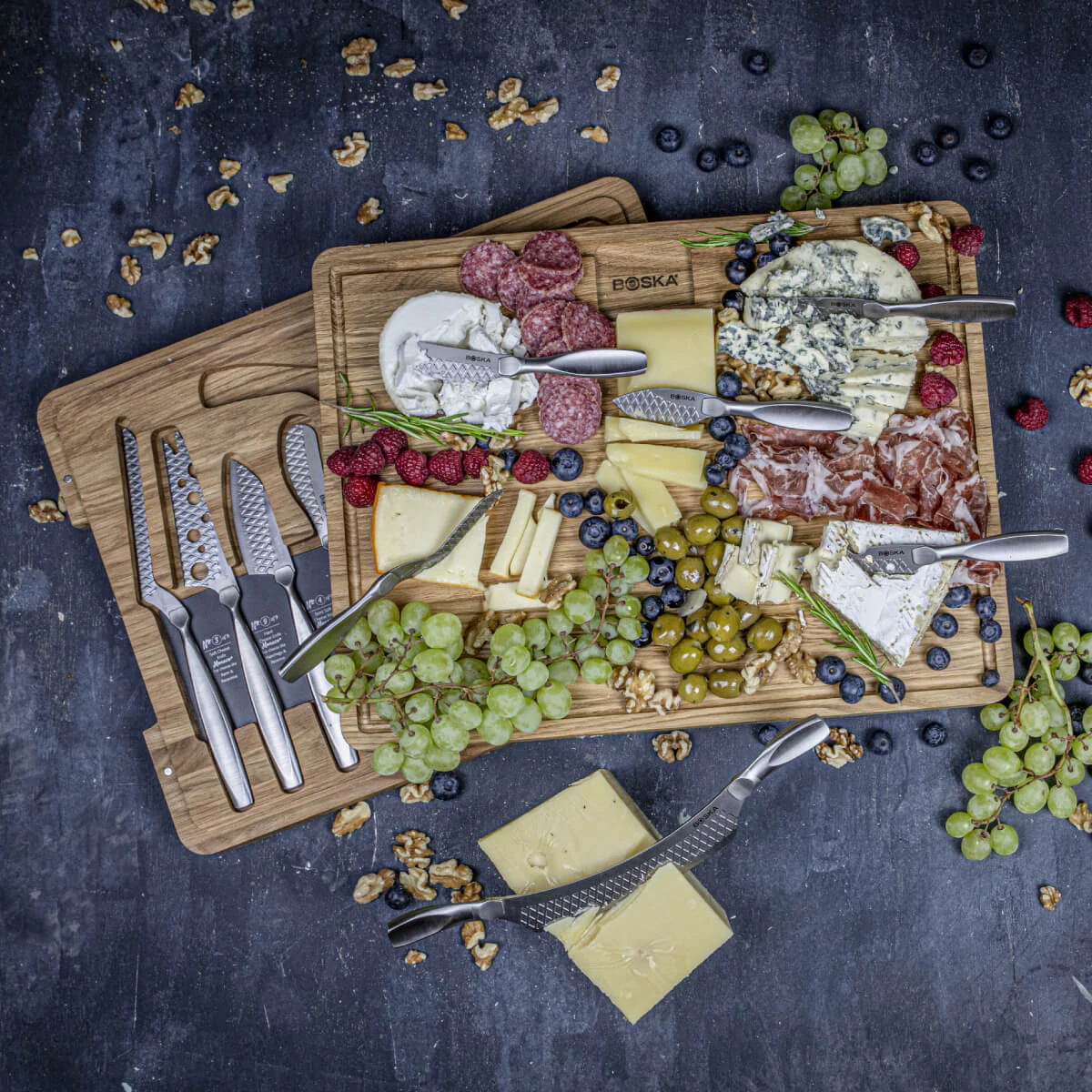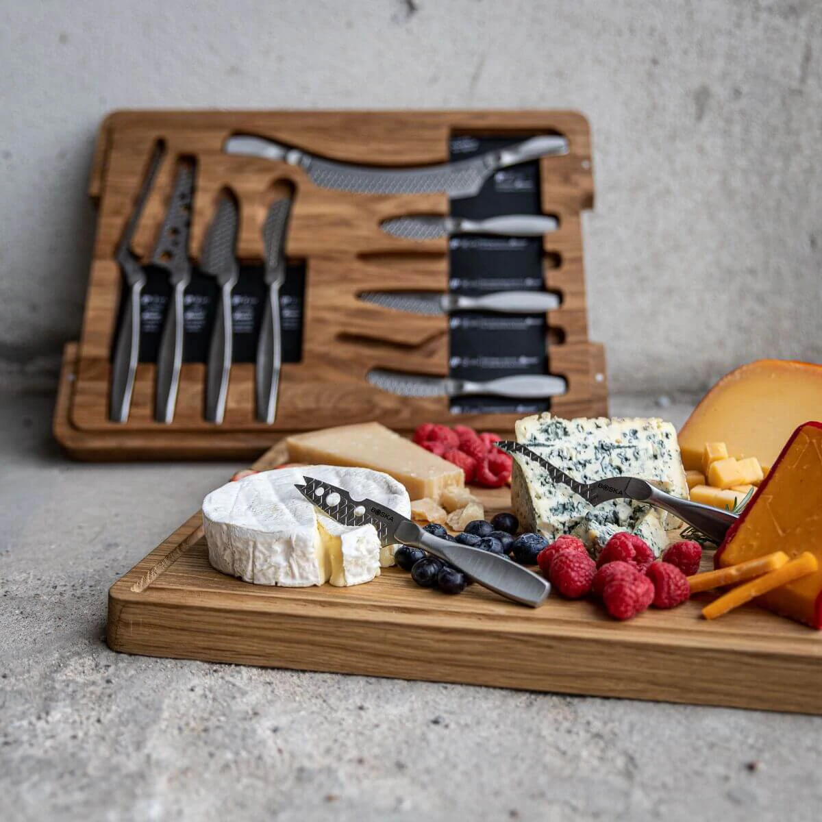 Serveer je gesneden kaas daarna mooi op de 2-in-1 serveerplank. Deze elegante eikenhouten plank bergt alle messen op en serveert ook je favoriete hapjes op een stijlvolle manier.