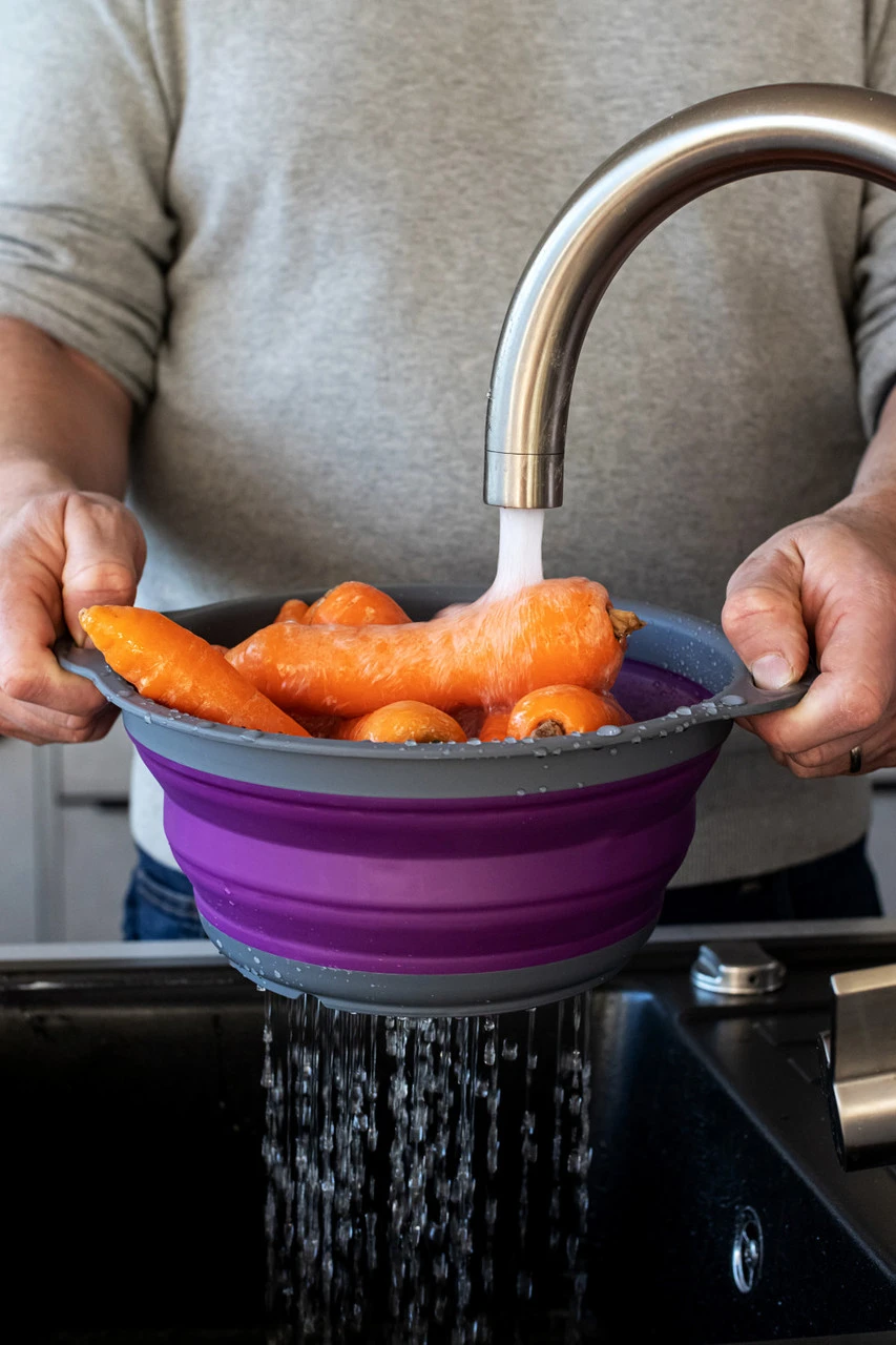 Met het Colourworks vergiet in het paars kan jij gemakkelijk de groentes wassen voor het koken. Klap het vergiet uit en leg dan de groentes in het vergiet. Er zitten 2 handgrepen aan het vergiet om het vast te houden. Het vergiet is gemaakt van duurzaam nylon en daardoor is het vergiet stevig. De diameter van het vergiet is 24 centimeter. Ook kan je pasta afgieten met dit vergiet, want het vergiet is hittebestendig tot 210 graden. Niet alleen kan je dit vergiet inklappen, maar het vergiet is ook nog eens vaatwasserbestendig.