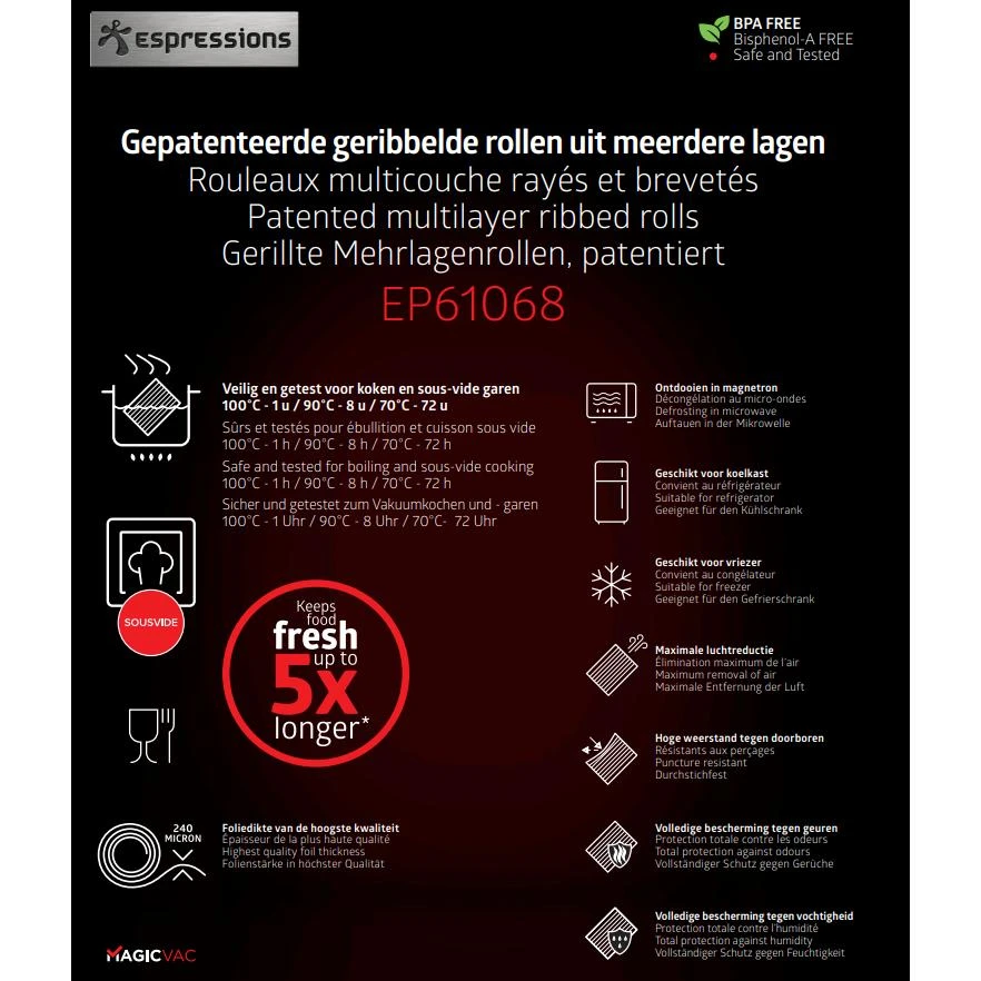 Garandeer dat er geen lucht of vocht meer bij je voedsel kan komen door te vacumeren met deze vacuumfolie van Espressions. Door te vacumeren kan je voedsel tot wel vijf keer langer bewaren en de smaken blijven behouden. Met de dikte van 240 micron zijn deze zakken van hoge kwaliteit en ze zijn BPA vrij. De formaten van dit folie is 20 bij 600 centimeter en het zijn 2 rollen. Ook geschikt voor sous vide koken! Let op: het sous vide koken is veilig en getest voor 100? voor 1 uur, 90? voor 8 uur, 70? voor 72 uur.
