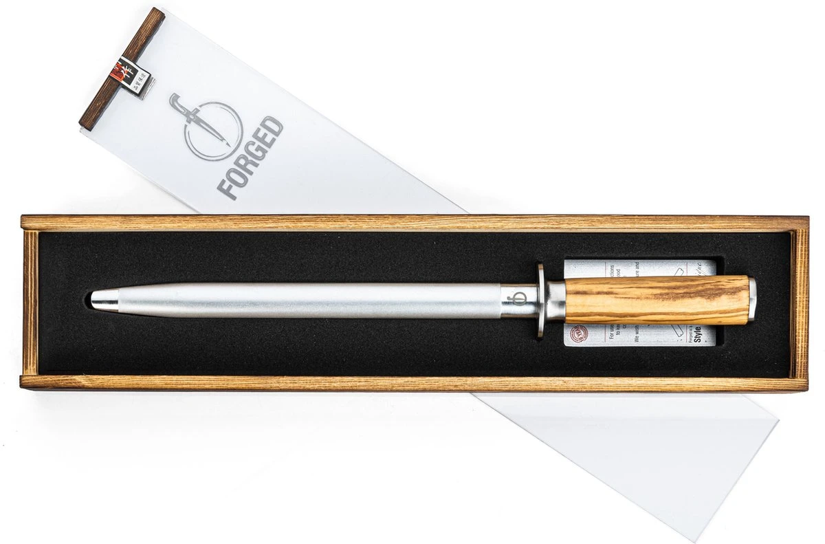 De Olive diamanten aanzetstaal slijpt een mes niet, maar het zorgt ervoor dat de bramen op het snijvlak weer in de richting van het snijvlak staan, waardoor het mes scherp blijft. Door het mes een aantal maal met het hele lemmet langs het aanzetstaal te halen, wordt het weer scherp. Belangrijk is om het mes steeds onder dezelfde hoek te houden. Verpakt in een luxe houten kistje.