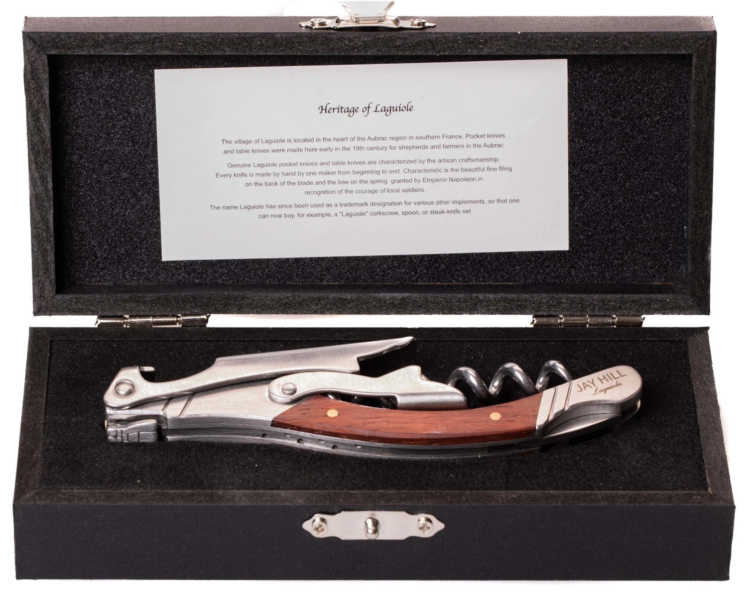 Zoek jij een kurkentrekker van kwaliteit met een mooi design? Deze multifunctionele Laguiole kurkentrekker van Jay Hill heeft een ergonomisch design met een stijlvolle look. Het handvat is gemaakt van modern rozenhout. Naast het scherpe lemmet is het zakmes ook voorzien van een kurkentrekker en handige flessenopener. Wil je deze kurkentrekker cadeau geven? De Jay Hill kurkentrekker wordt geleverd in een luxe houten kist met mooie geschenkverpakking.