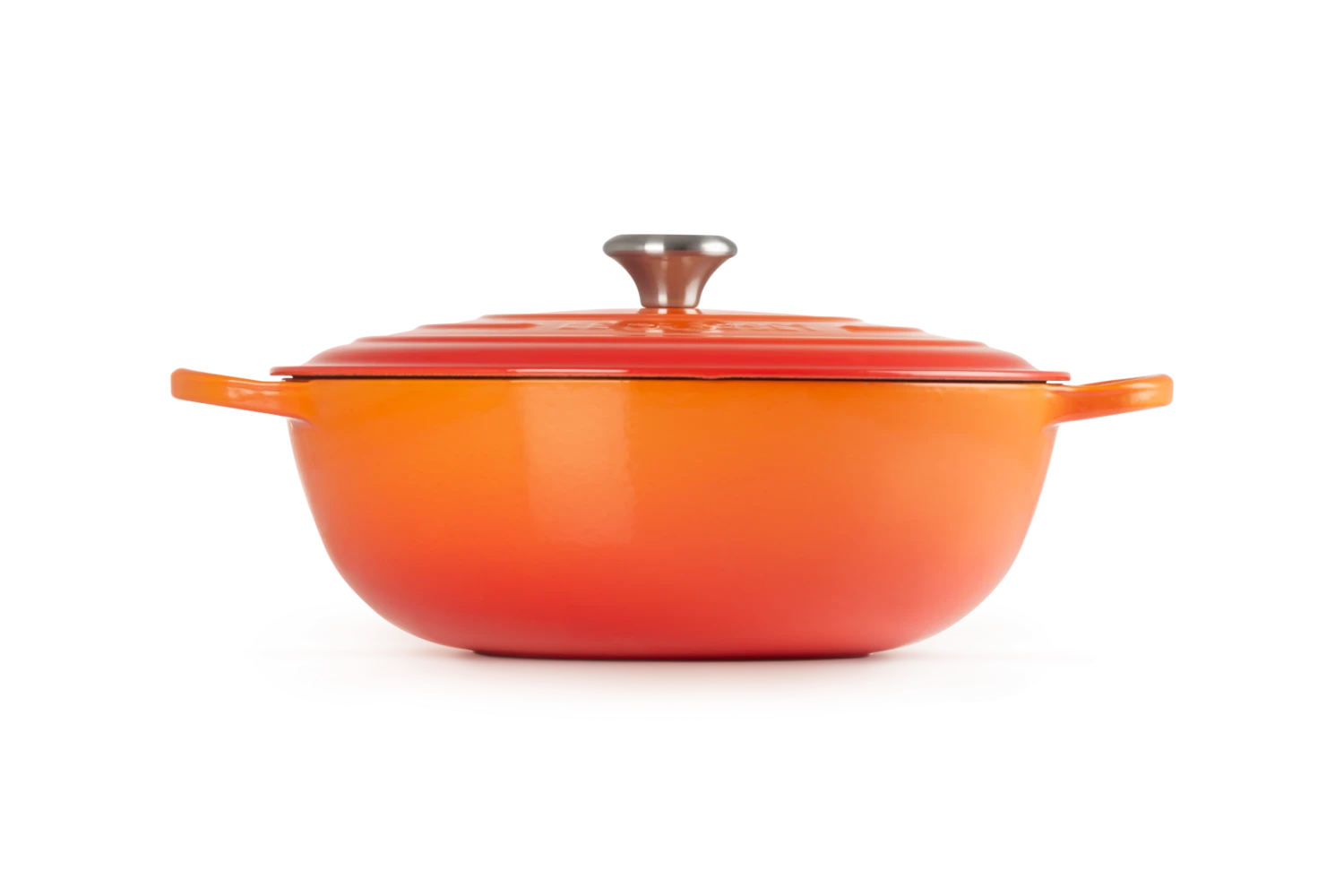 Ben jij op zoek naar een praktische en stijlvolle braadpan? Dan is de Le Creuset Marmite in de prachtige kleur oranjerood wat voor jou. De pan heeft een lengte van 41,9 centimeter en een inhoud van 7 liter, dit maakt hem geschikt voor 6 à 7 personen. De afgeronde zijwanden zorgen voor gemakkelijk roeren en een moeiteloze bereiding van eenpansgerechten. De braadpan is vervaardigd uit geëmailleerd gietijzer wat de warmte vasthoudt, zodat het eten gelijkmatig kan bakken en bruinen.