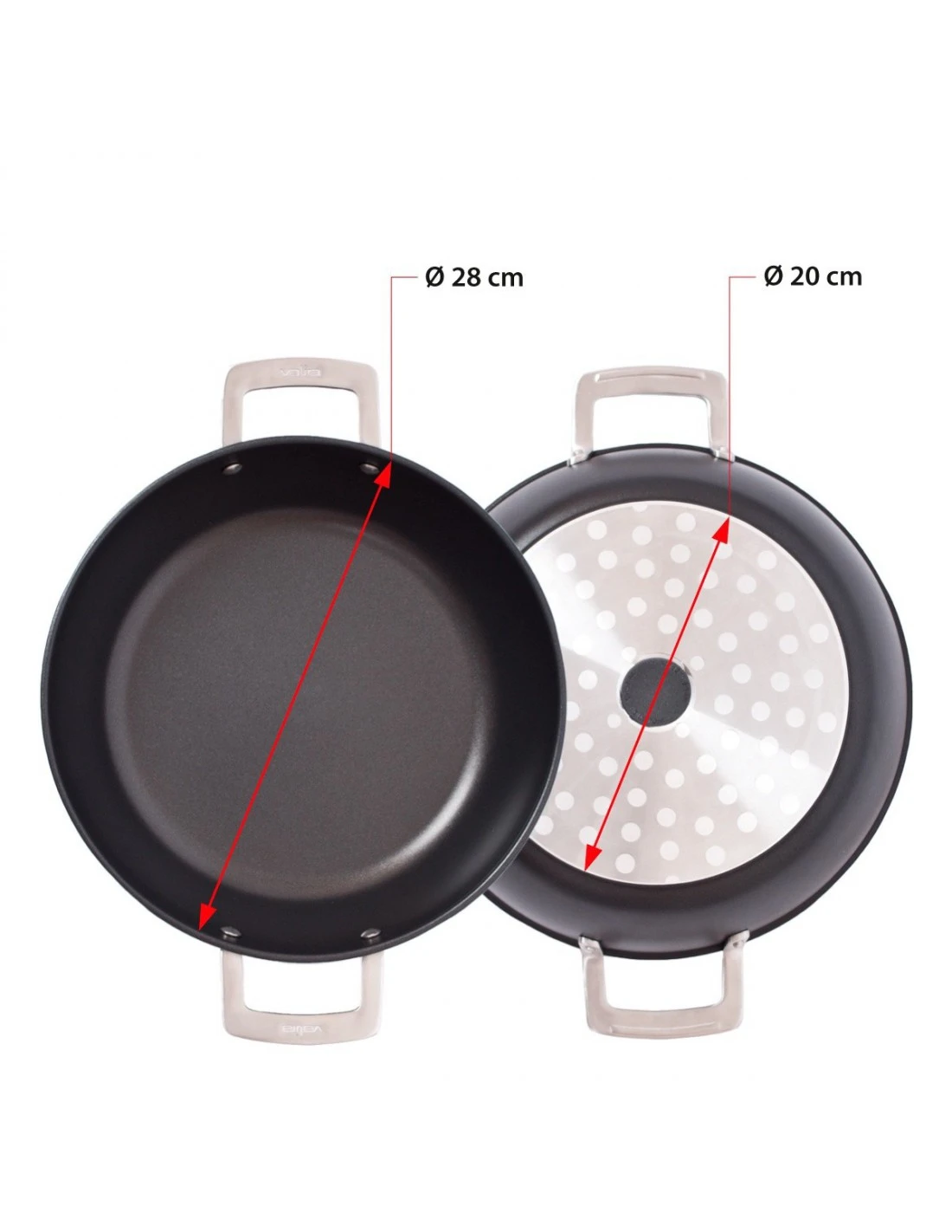 De Hapjespan heeft een diameter van 28 cm en beschikt over een meerlaagse antiaanbaklaag die is versterkt met titaniumdeeltjes en vrij van PFOA. De 6 mm dikke bodem zorgt voor een gelijkmatige en zeer snelle warmteverdeling. De pan word geleverd met een glazen deksel en kan na gebruik gemakkelijk met de hand gereinigd worden.